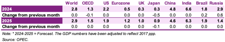 Глобальный экономический рост в 1К24 превзошел ожидания в нескольких странах, но не оправдал ожиданий в некоторых крупных странах ОЭСР. Учитывая сохраняющиеся проблемы, прогноз роста мировой экономики на 2024 год остается неизменным на уровне 2,8%.
