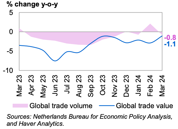 В стоимостном выражении в марте наблюдалось снижение на 1,1% по сравнению с аналогичным периодом прошлого года после более выраженного снижения на 2,9% по сравнению с аналогичным периодом прошлого года в феврале и на 2,1% по сравнению с аналогичным периодом прошлого года в январе. Эти цифры основаны на индексе CPB World Trade Monitor, предоставленном Нидерландским бюро анализа экономической политики CPB.