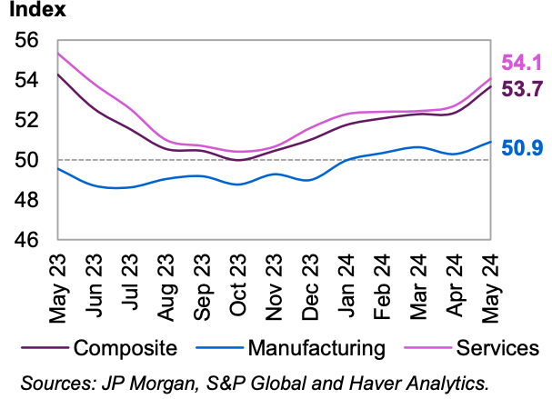 Аналогичным образом, глобальный PMI сектора услуг значительно увеличился на 1,4 индексных пункта и достиг 54,1 в мае по сравнению с 52,7 в апреле и 52,4 в марте.