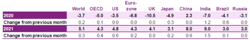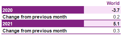 Рис. 4 Темпы роста экономики в мире и пересмотр показателей, 2020-2021 годы, %