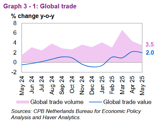 В мае объем мировой торговли продолжил расти, но более медленными темпами. Объем мировой торговли в мае этот показатель увеличился на 3,5% в годовом исчислении после 4,3% в апреле и 6,6% в марте. Объем торговли в стоимостном выражении вырос на 2,0% в годовом исчислении в мае по сравнению с 2,2% в апреле и 0,9% в марте. Показатели объема торговли отражают тенденцию к нормализации после значительного увеличения, наблюдавшегося в преддверии введения тарифов в США в апреле.