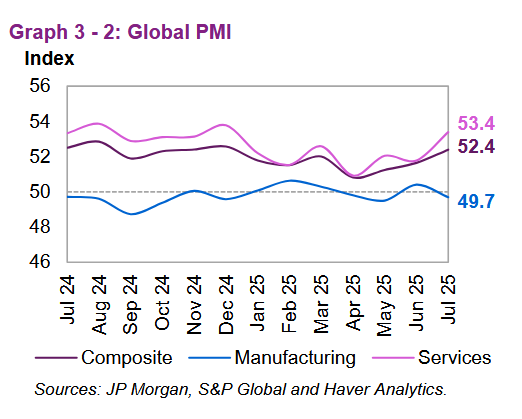 В июле глобальные индексы менеджеров по закупкам (PMI) сигнализировали о смягчении прогнозов в обрабатывающей промышленности, в то время как сектор услуг продолжал расширяться.