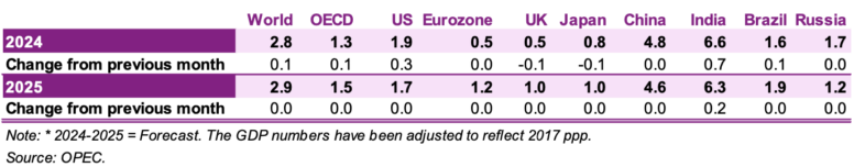 Учитывая устойчивую тенденцию глобального экономического роста, наблюдавшуюся во второй половине 2023 года, в сочетании с недавно опубликованными экономическими показателями из США, Индии и Китая, а также ожидая продолжения благоприятной динамики глобального роста, прогноз экономического роста на 2024 год был немного пересмотрен в сторону повышения. Сейчас он составляет 2,8% по сравнению с 2,7% в предыдущем месяце.
