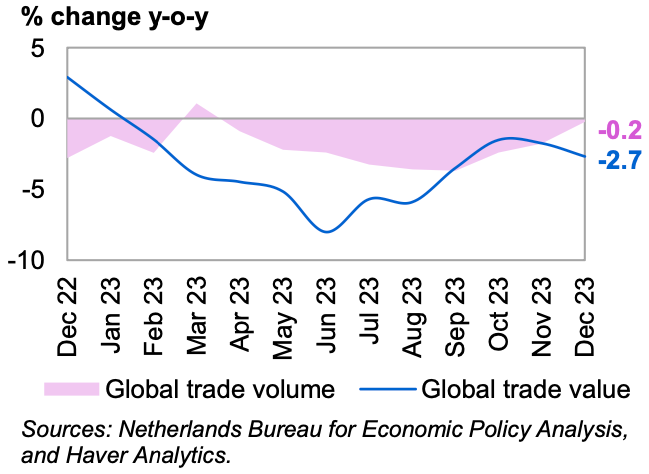 Что касается мировой торговли, то в конце прошлого года объемы постепенно улучшались, но снижение цен на сырьевые товары к концу 2023 года снова привело к снижению индекса стоимостной торговли.
