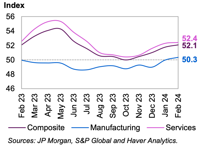 В положительной тенденции глобальный PMI сектора услуг увеличился до 52,4 в феврале по сравнению с 52,3 в январе.