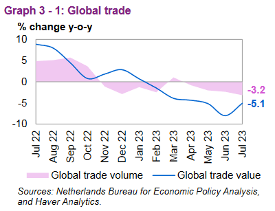 Глобальная торговля продолжила замедляющуюся годовую тенденцию в объемном и стоимостном выражении. Торговля в стоимостном выражении снизилась на 5,1% по сравнению с аналогичным периодом прошлого года в июле после снижения на 8% по сравнению с аналогичным периодом прошлого года в июне, согласно данным