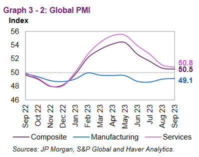 Глобальные индексы менеджеров по закупкам (PMI) в сентябре отражают некоторые замедляющиеся тенденции в секторе услуг и сохраняющуюся сложную ситуацию в производстве. Глобальный производственный PMI немного вырос и составил 49,1 в сентябре после уровня 49,0 в августе и по сравнению с 48,6 в июле. Глобальный PMI сектора услуг упал до 50,8 в сентябре после 51,1 в августе и по сравнению с 52,7 в июле. Прогноз роста мировой экономики на 2023 год был пересмотрен в сторону повышения до 2,8%. При этом учитывается уверенный рост в 1П23 и сохранение устойчивой базовой динамики в 3К23. Глобальный экономический рост в 2024 году останется на уровне 2,6%, не изменившись по сравнению с предыдущим месяцем.