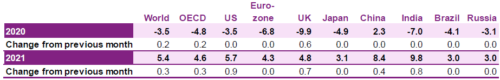 Рис. 1 Темп роста экономики в мире и пересмотр показателей в 2020-2021 годах, %