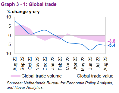 Торговля в стоимостном выражении снизилась на 5,4% по сравнению с аналогичным периодом прошлого года в августе после снижения на 5,2% по сравнению с аналогичным периодом прошлого года в июле и -8% по сравнению с аналогичным периодом прошлого года в июне, согласно индексу CPB World Trade Monitor.