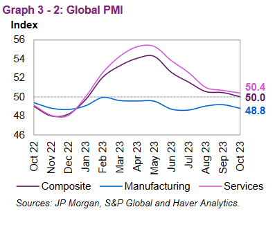 Глобальные индексы менеджеров по закупкам (PMI) в октябре отразили некоторые замедляющиеся тенденции в секторе услуг и сохраняющуюся сложную ситуацию в производстве. Глобальный производственный PMI снизился в октябре после небольшого улучшения в сентябре. В октябре он составлял 48,8 после 49,2 в сентябре и 49,0 в августе. Глобальный PMI сектора услуг упал до 50,4 в октябре после уровня 50,7 в сентябре и 51 в августе. Учитывая последние уровни экономического роста в третьем квартале, прогноз мирового экономического роста в 2023 году остается неизменным и составит 2,8%. Мировой экономический рост в 2024 году останется на уровне 2,6%.