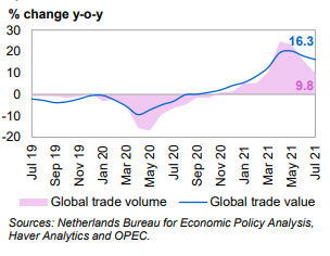 Мировая торговля продолжает восстановление, но не на высоком уровне. Это может быть связано с дефицитом предложения, и эта тенденция может продолжиться. В июле объемы мировой торговли снизились и составили 9,9% после роста на 15,8% в июне и на 23,3% в мае в годовом соотношении, согласно индексу мировой торговли CPB, предоставленному Нидерландским бюро анализа экономической политики. Торговля снизилась и в стоимостном выражении, хотя и в меньшей степени, увеличившись на 16,3% по сравнению с 17,9% в июне и 20,2% в мае в годовом соотношении.
