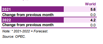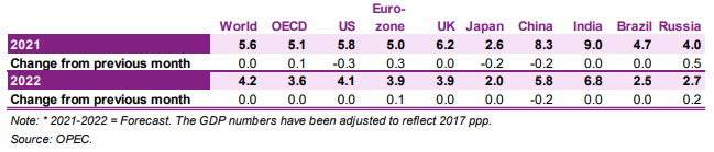 Прогноз для России на 2021 год был пересмотрен в сторону повышения с 3,5% до 4% с учетом усилий стран-участниц ОПЕК и стран, не входящих в ОПЕК, стабилизировать рынок нефти, при этом прогноз на 2022 год так же пересмотрен в сторону повышения с 2,5% до 2,7%.