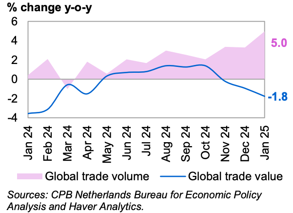 Мировая торговля увеличилась в объеме, но сократилась в стоимостном выражении третий месяц подряд. В январе 2025 года объем мировой торговли увеличился на 5,0% по сравнению с аналогичным периодом прошлого года, по сравнению с 3,3% в декабре и 3,4% в ноябре. Однако стоимостной объем торговли в январе снизился на 1,8% по сравнению с аналогичным периодом прошлого года после снижения на 0,9% в декабре и 0,2% в ноябре, согласно данным CPB World Trade Monitor. Такое расхождение отражает текущие ценовые эффекты, включая волатильность обменных курсов, стоимость доставки и растущее влияние тарифов.