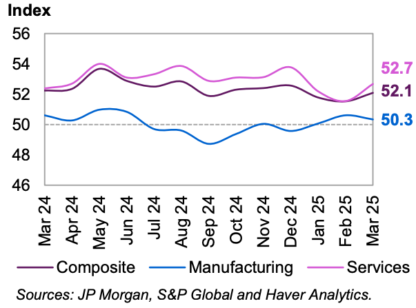 В марте глобальные индексы менеджеров по закупкам (PMI) продемонстрировали продолжение роста в сфере услуг и смягчение перспектив в обрабатывающей промышленности, при этом оба показателя остались на территории экспансии.