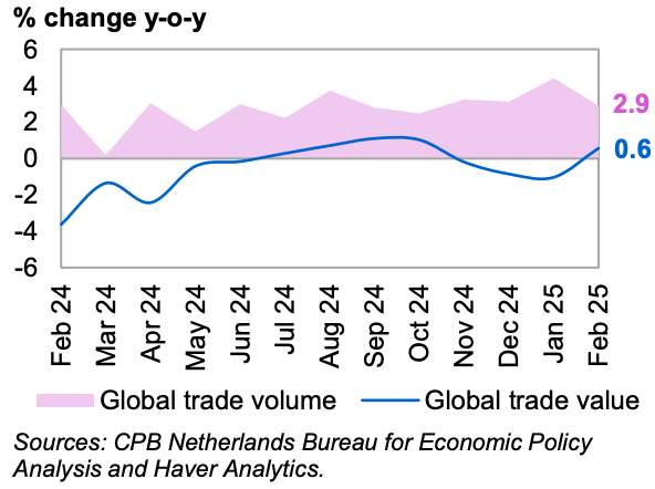 Объем мировой торговли в феврале увеличился в стоимостном выражении, но снизился. Объем мировой торговли увеличился на 2,9% по сравнению с аналогичным периодом прошлого года, хотя и снизился по сравнению с 4,4% в январе и 3,1% в декабре 2024 года. Стоимостной объем торговли в феврале вырос на 0,6% по сравнению с аналогичным периодом прошлого года, сменив сокращение на 1,0% в январе и 0,8% в декабре. Восстановление стоимости торговли отражает эффект опережающего роста в преддверии ожидаемых тарифов, хотя расхождение между объемом и стоимостью по-прежнему обусловлено укреплением доллара.