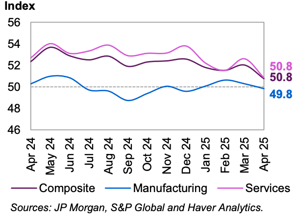 Глобальный индекс PMI в сфере услуг замедлился до 50,8 в апреле по сравнению с 52,6 в марте и 51,5 в феврале.