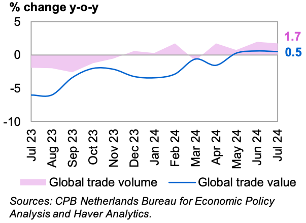 В стоимостном выражении в июле наблюдался рост на 0,5% в годовом исчислении, что почти соответствует темпу роста в июне в 0,6%. Это представляет собой улучшение по сравнению с маем, в котором был зафиксирован рост на 0,2%. Эти данные получены из индекса CPB World Trade Monitor, предоставленного Нидерландским бюро анализа экономической политики CPB.