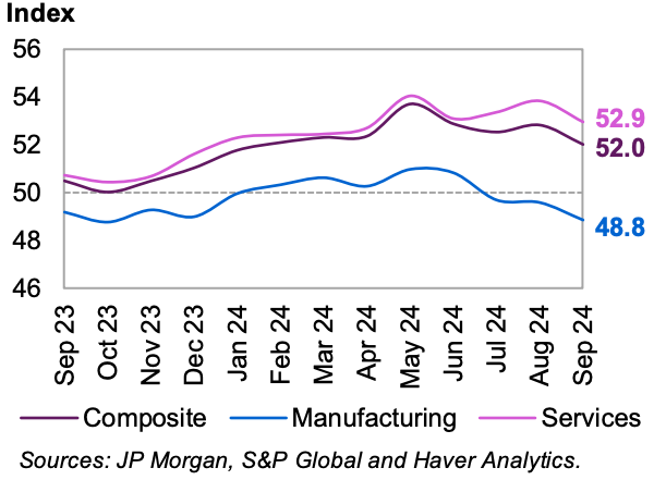 В сентябре глобальные индексы менеджеров по закупкам (PMI) указали на продолжающиеся проблемы в производственном секторе. После периода относительно стабильной динамики, поддержанной немного более высокими показателями в развивающихся экономиках, глобальный производственный PMI остался ниже уровня 50, указывающего на рост. Это говорит о сохраняющихся трудностях в секторе, особенно в развитых экономиках, что является сигналом о продолжающемся замедлении. Кроме того, индекс сектора услуг испытал небольшое снижение, что указывает на то, что поддержка со стороны этой критической области мировой экономики все еще присутствует, но начинает ослабевать.