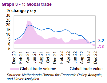 Было подтверждено, что ВВП США достиг 2,1% в 2022 году, в то время как ВВП еврозоны в 2022 году составил 3,5%. Хотя рост ВВП Китая в 2022 году составил всего 3%, индикаторы настроений указывают на восстановление экономической активности в этом году. Валовой располагаемый доход домашних хозяйств в четвертом квартале 2022 года и некоммерческих организаций, обслуживающих домашние хозяйства (НКОДХ), достиг 4,5% в годовом исчислении в США. Это самый высокий квартальный уровень в 2022 году. В еврозоне располагаемый доход вырос на 7,1% г/г в третьем квартале с 5,1% г/г во втором квартале 2022. Этому способствовал сильный рост заработной платы в странах с развитой экономикой, который, согласно последним данным, вырос на 6,1% в третьем квартале 2022 года в еврозоне и на 7,5% в четвертом квартале 2022 года в США. В то же время валовая норма сбережений в США увеличилась до 7,9% в четвертом квартале 2022 года с 7,3% в третьем квартале 2022 года. Это сопоставимо со среднегодовым показателем 7,7% в 2022 году и допандемическим уровнем около 10%. Норма сбережений в еврозоне снизилась, но в третьем квартале 2022 года оставалась стабильной на уровне 13,3% по сравнению с 13,4% во втором квартале 2022 года и допандемическим уровнем около 12%. Нормы сбережений остаются на разумном уровне и могут по-прежнему компенсировать потери доходов при дальнейшем повышении процентных ставок. Это будет важно, поскольку мировая инфляция остается высокой в странах с развитой экономикой: в США зафиксирован уровень 6,3% в январе, а в еврозоне — 8,5% в феврале. Мировая торговля увеличилась в декабре в стоимостном выражении, увеличившись на 3,2% в годовом исчислении, после роста на 2,2% в годовом исчислении в ноябре, согласно индексу CPB World Trade Monitor. Торговля в натуральном выражении снизилась на 3% г/г в декабре по сравнению со снижением на 1% г/г в ноябре. Экспорт в декабре и ноябре упал на 10,9% г/г и на 8,9% г/г соответственно.