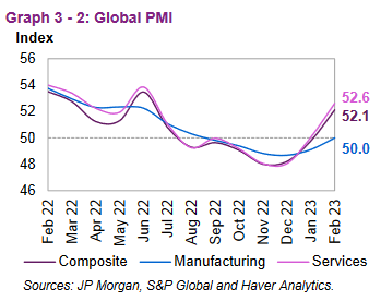Мировой рост будет в значительной степени зависеть от динамики инфляции и последующей денежно-кредитной политики. Похоже, что в ключевых странах ОЭСР динамика в начале года была стабильной, хотя риски ухудшения сохраняются. Ожидается, что ЕЦБ продолжит резко повышать процентные ставки в 2023 году, что приведет к более серьезным последствиям с точки зрения снижения экономической активности в еврозоне. Ожидается, что ФРС повысит ставки еще на 50 базисных пунктов в первой половине 2023 и, возможно, еще на 25 базисных пунктов во второй половине 2023. Прогнозируется, что ЕЦБ поднимет процентные ставки еще на 75 базисных пунктов к первой половине 2023 и еще на 25 базисных пунктов во второй. Помимо более жесткой денежно-кредитной политики, риски ухудшения включают рост цен на сырьевые товары в связи с текущими геополитическими событиями. Продолжающиеся внутренние проблемы в Китае на фоне все еще неустойчивого сектора недвижимости — еще одна область, на которую стоит обратить внимание. Глобальные индексы менеджеров по закупкам (PMI) за февраль отражают сохраняющуюся динамику как в производственном секторе, так и в секторе услуг крупнейших экономик. Мировой производственный PMI вырос до 50. Глобальный PMI сектора услуг увеличился до 52,6 в феврале, что на 2,6 пункта больше, чем в январе.