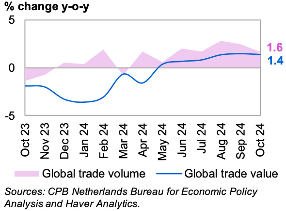 Стоимостной объем торговли в октябре увеличился на 1,4 % по сравнению с аналогичным периодом прошлого года, что не изменилось по сравнению с сентябрем и после роста на 1,3 % в августе. Эти данные взяты из индекса CPB World Trade Monitor, предоставляемого нидерландским Бюро анализа экономической политики CPB.
