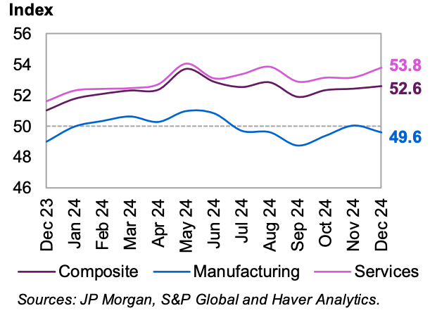 В декабре глобальные индексы менеджеров по закупкам (PMI) указали на небольшое снижение активности в производственном секторе, в результате чего уровень индекса вернулся на территорию сокращения ниже 50. Индекс сектора услуг в декабре значительно ускорился, что свидетельствует о продолжающейся поддержке этой важнейшей области мировой экономики.