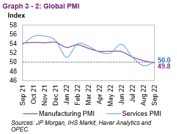 Ожидается, что в свете этих событий и ЕЦБ, и ФРС активизируют свои усилия по ужесточению денежно-кредитной политики к концу 2022 и в 2023 годах. Глобальные индексы менеджеров по закупкам (PMI) отражают последнее замедление роста в основных экономиках. Мировой индекс PMI в обрабатывающей промышленности в сентябре снизился до 49,8, что указывает на уровень 50. Это по сравнению с 50,3 в августе и 51,1 в июле. Глобальный PMI сектора услуг восстановился до 50 в сентябре по сравнению с 49,3 в августе и 51,1 в июле. Принимая во внимание текущие проблемы и ожидаемое замедление в четвертом квартале 2022 и первом квартале 2023 года, глобальный экономический рост на 2022 и 2023 годы был пересмотрен в сторону понижения.