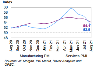 Нехватка рабочей силы в сочетании с вновь растущим числом заражений также замедлили восстановление в секторе по оказанию услуг. В связи с ростом случаев заражения COVID-19 сфера туризма и досуга может оказаться особенно уязвимой. Сфера услуг, являясь основным фактором для ускоренного восстановления экономики, требует тщательного мониторинга, особенно в США. Ряд факторов, таких как переговоры в Конгрессе США касательно бюджета и долга, а так же по смягчению ситуации на рынке труда и, в некоторой степени, о прекращении системы социальной поддержки, связанной с COVID-19, вызывают неопределенность.