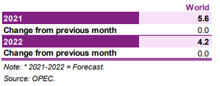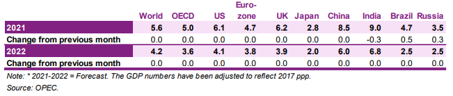 Ожидается, что экономика Китая вырастет на 8,5% в 2021 году и на 6% в 2022 году, что соответствует оценке предыдущего месяца. Между тем, прогноз роста Индии на 2021 год понижен до 9% после более слабого, чем ожидалось, восстановления во втором квартале 2021 года, хотя рост на 2022 год остается неизменным на уровне 6,8%. Учитывая сильный рост во втором квартале 2021 года, прогноз роста для Бразилии на этот год был пересмотрен с 4,2% до 4,7%, в то время как рост в 2022 г. остается неизменным на уровне 2,5%. Прогноз для России на 2021 год пересмотрен до 3,5% с учетом выгод ОПЕК и усилия стран, не входящих в ОПЕК, по стабилизации нефтяного рынка, в то время как прогноз на 2022 год остается неизменным на уровне 2,5%.