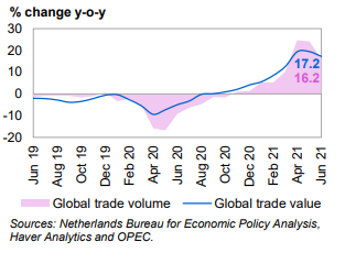 Являясь очень важным фактором, мировая торговля продолжает расти, однако рост может быть замедлен дефицитом предложения. Другая проблема, вызывающая сокращение в данных за год — это базовые эффекты за прошлый год. В июне объемы мировой торговли выросли на 16,2% в годовом исчислении, после чего рост до 24,1 % был зафиксирован в мае, рост на 24,1% и на 24,7% в апреле, на основе индекса мировой торговли CPB, предоставленным Нидерландским бюро анализа экономической политики. Торговля уменьшилась в стоимостном выражении, увеличившись на 17,2% в июне, по сравнению с 19,4% в мае и апреле ( по сравнению с прошлым годом).