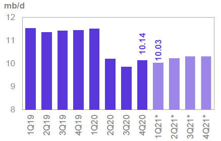 Объемы производства жидких видов топлива в 2020 году составили 10.42 млн. баррелей в день, что на 1.02 млн. баррелей в день меньше, чем в 2019 году.