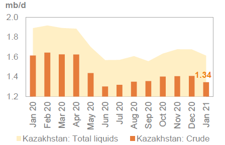 В январе 2021 году объемы производства жидких видов топлива сократились до 1.61 млн. барреле йв день.