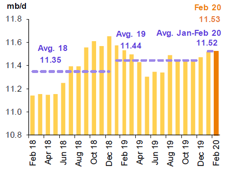В Январе объемы производства сырой нефти увеличились на 46 тыс. баррелей в день до 10.66 млн. баррелей в день. В феврале данный показатель возрос ещё на 10 тыс. баррелей в день до 10.67 млн. баррелей в день.