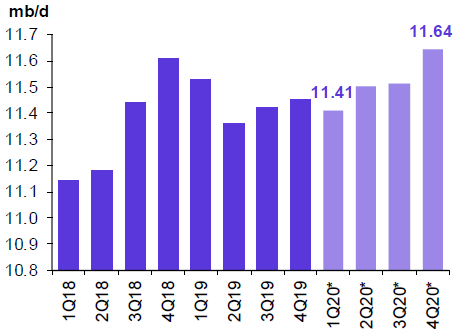 Ожидается, что в 2020 году объемы производства жидких видов топлива в России увеличатся на 0.08 млн. баррелей в день до 11.52 млн. баррелей в день. Прогноз на первый квартал 2020 года был скорректирован в сторону снижения. Средний уровень производства жидких видов топлива в период со второго по четвертый кварталы 2020 года составит 11.55 млн. баррелей в день.