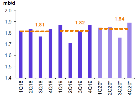 Ожидается, что в 2020 году объемы производства жидких видов топлива возрастут на 0.02 млн. баррелей в день до 1.84 млн. баррелей в день.
