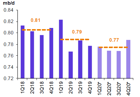 Прогнозируется, что в 2020 году объемы нефтедобычи снизятся на 0.01 млн. баррелей в день до 0.77 млн. баррелей в день.