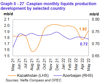 Добыча жидких углеводородов в Казахстане увеличилась на 148 тб/д до среднего уровня 1,9 млн б/д в мае. Добыча сырой нефти выросла на 109 тыс. б/д по сравнению с предыдущим месяцем и составила в среднем 1,5 млн. б/д. Производство газоконденсатов увеличилось на 39 тб/д по сравнению с предыдущим месяцем и составило в среднем 0,4 млн б/д. Прогноз предложения жидких углеводородов в Казахстане на 2022 год, по прогнозам, вырастет на 120 тб/д до среднего уровня 1,95 млн б/д, без изменений по сравнению с оценкой предыдущего месяца. Прогнозируется, что в 2023 году предложение жидких углеводородов увеличится на 60 тб/д, в основном за счет увеличения добычи на Кашаганском нефтяном месторождении. Ожидается также незначительный рост добычи нефти на месторождении Тенгиз и добычи газового конденсата на месторождении Карачаганак.