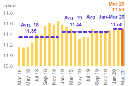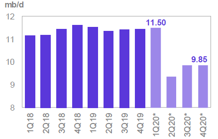 Ожидается, что в 2020 году объемы производства жидких видов топлива сократятся на 1.30 млн. баррелей в день до 10.14 млн. баррелей в день. Этот показатель был пересмотрен в сторону снижения на 1.38 млн. баррелей в день по сравнению с предшествующим месяцем. Россия сократит нефтедобычу больше всех среди участников соглашения ОПЕК+.