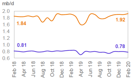В марте объемы производства конденсатов остались на прежнем уровне — 0.91 млн. баррелей в день.