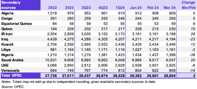 По данным вторичных источников, общий объем добычи сырой нефти ОПЕК-12 в марте 2024 года составил в среднем 26,60 млн баррелей в сутки, что на 3 трлн в сутки выше по сравнению с предыдущим месяцем. Добыча сырой нефти увеличилась в основном в Иране, Суади Аравии, Габоне и Кувейте, тогда как добыча в Нигерии, Ираке и Венесуэле снизилась.