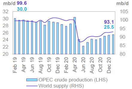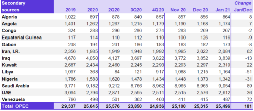 Согласно вторичным источникам, объемы нефтедобычи в странах ОПЕК в январе 2021 года составили 25.50 млн. баррелей в день, что на 0.18 млн. баррелей в день больше, чем в предшествующем месяце. В наибольшей степени показатель возрос в Саудовской Аравии, Венесуэле и Иране, а сократился — в Ливии и Нигерии. В январе объемы нефтедобычи в Ливии снизились до 1.16 млн. баррелей в день.