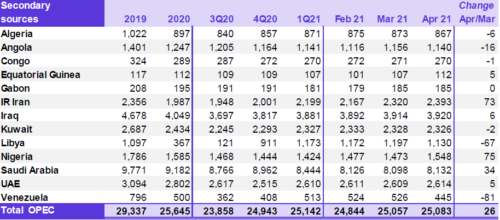 Согласно вторичным источникам, объемы нефтедобычи в сранах ОПЕК в апреле 2021 года составили 25.08 млн. баррелей в день, что на 0.3 млн. баррелей в день больше, чем в предшествующем месяце.
