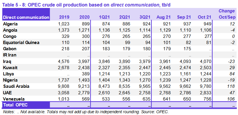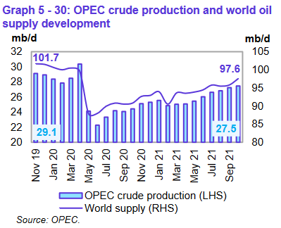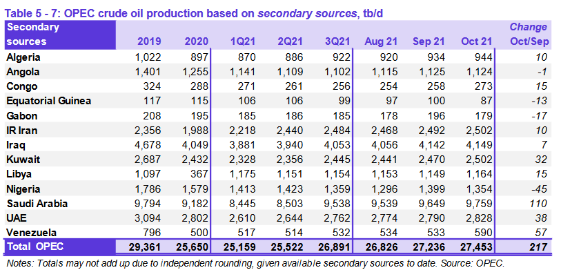 Согласно вторичным источникам, общая добыча сырой нефти ОПЕК-13 в октябре 2021 года составила в среднем 27,45 млн баррелей в день (б/д), что на 0,22 млн б/д выше, чем в пролом месяце. Добыча сырой нефти увеличилась в основном в Саудовской Аравии, Венесуэле, ОАЭ и Кувейте. В Нигерии, Габоне и Экваториальной Гвинее наблюдался спад.