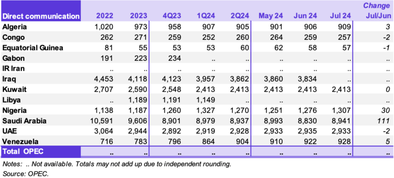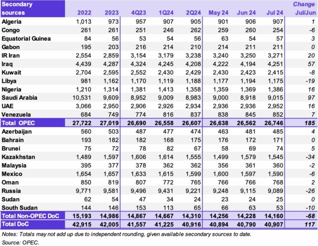 Согласно вторичным источникам, общая добыча сырой нефти ОПЕК-12 в среднем составила 26,75 мб/д в июле 2024 года, что на 185 ТБ/д выше, м-о-м. Добыча сырой нефти увеличилась в основном в Саудовской Аравии, Ираке и ИР Иране, тогда как добыча в Ливии снизилась.