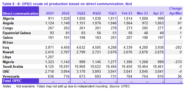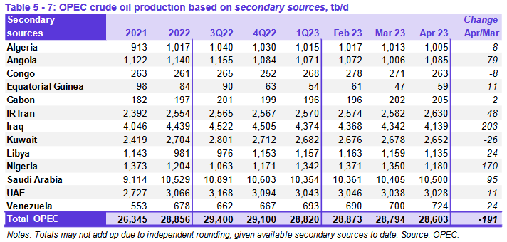 Согласно вторичным источникам, общая добыча сырой нефти ОПЕК-13 в среднем составляла 28,6 млн баррелей в сутки в апреле 2023 года. Это на 191 трлн баррелей в сутки ниже в месячном исчислении. Добыча сырой нефти увеличилась в основном в Саудовской Аравии, Анголе и Иране. Добыча упала в Ираке и Нигери.