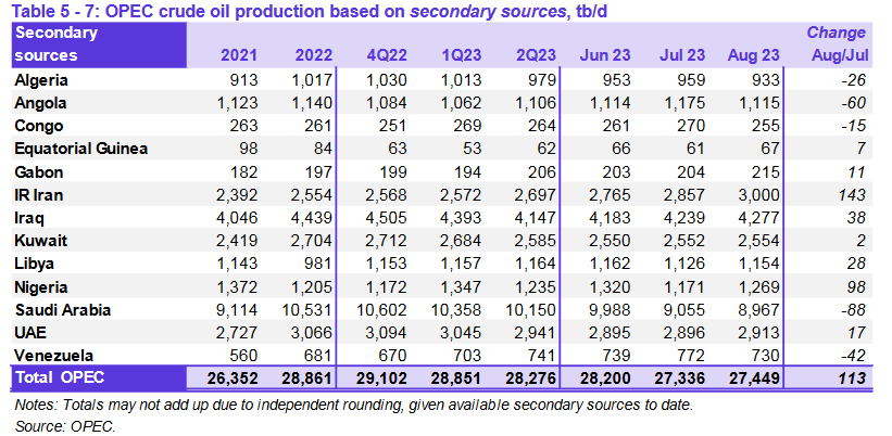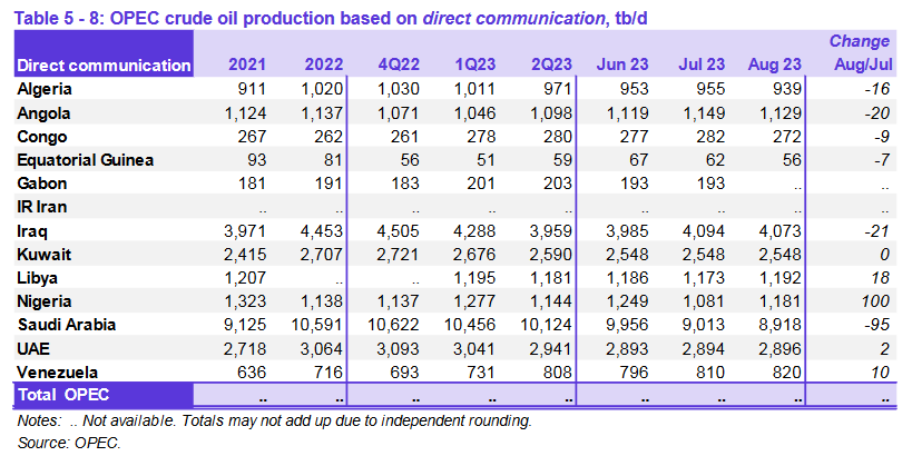 OPEC.Объемы нефтедобычи по странам от 12 сентября 2023