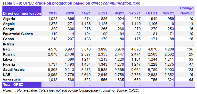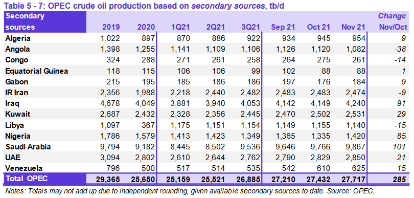 Согласно вторичным источникам, общая добыча сырой нефти ОПЕК-13 в ноябре 2021 года составила в среднем 27,72 млн баррелей в день (б/д), что на 0,29 млн б/д больше по сравнению с предыдущим месяцем. Добыча сырой нефти увеличилась в основном в Саудовской Аравии, Ираке и Нигерии и снизилась в Анголе, Ливии и Конго.