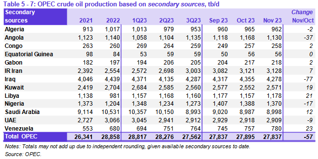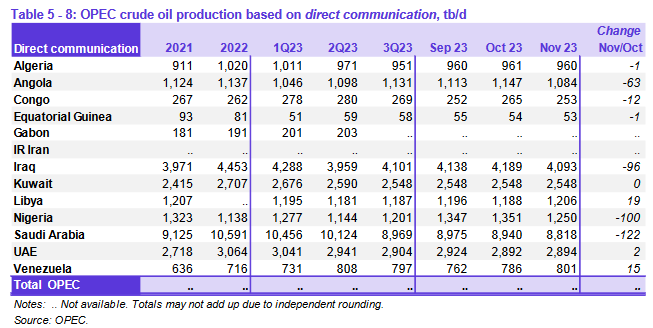 OPEC.Объемы нефтедобычи по странам от 13 декабря 2023