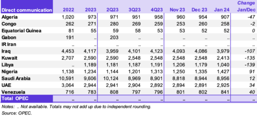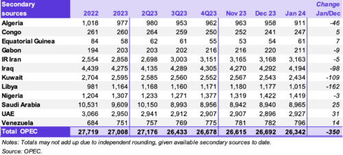 По данным вторичных источников, общий объем добычи сырой нефти ОПЕК-12 в январе 2024 года составил в среднем 26,34 млн баррелей в сутки, что на 350 тыс. баррелей в сутки меньше, чем в предыдущем месяце. Добыча сырой нефти выросла в основном в ОАЭ, Саудовской Аравии и Венесуэле, тогда как добыча в Ливии, Кувейте, Ираке и Алжире снизилась.