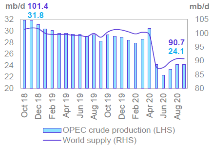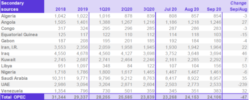 Согласно вторичным источникам, объемы добычи сырой нефти в странах ОПЕК в сентябре 2020 года составили 24.11 млн. баррелей в день, что на 0.05 млн. баррелей в день меньше, чем в предшествующем месяце.